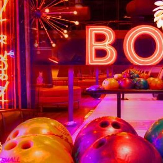 Modern bowling alley with pool, an American restaurant, a bar & upscale private lanes.